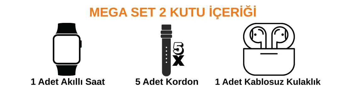 Günlük kullanım, spor ve eğlenceyi tek pakette birleştiren Series 10 Mega Set; Akıllı Saat + Kablosuz Kulaklık + 5 Adet Kordon içeriğiyle eksiksiz bir teknoloji deneyimi sunar. Geniş AMOLED ekranlı akıllı saat, kompakt ve güçlü ses sunan kulaklık ve farklı kombinlere uyum sağlayan kordonlar tek sette buluşur.
